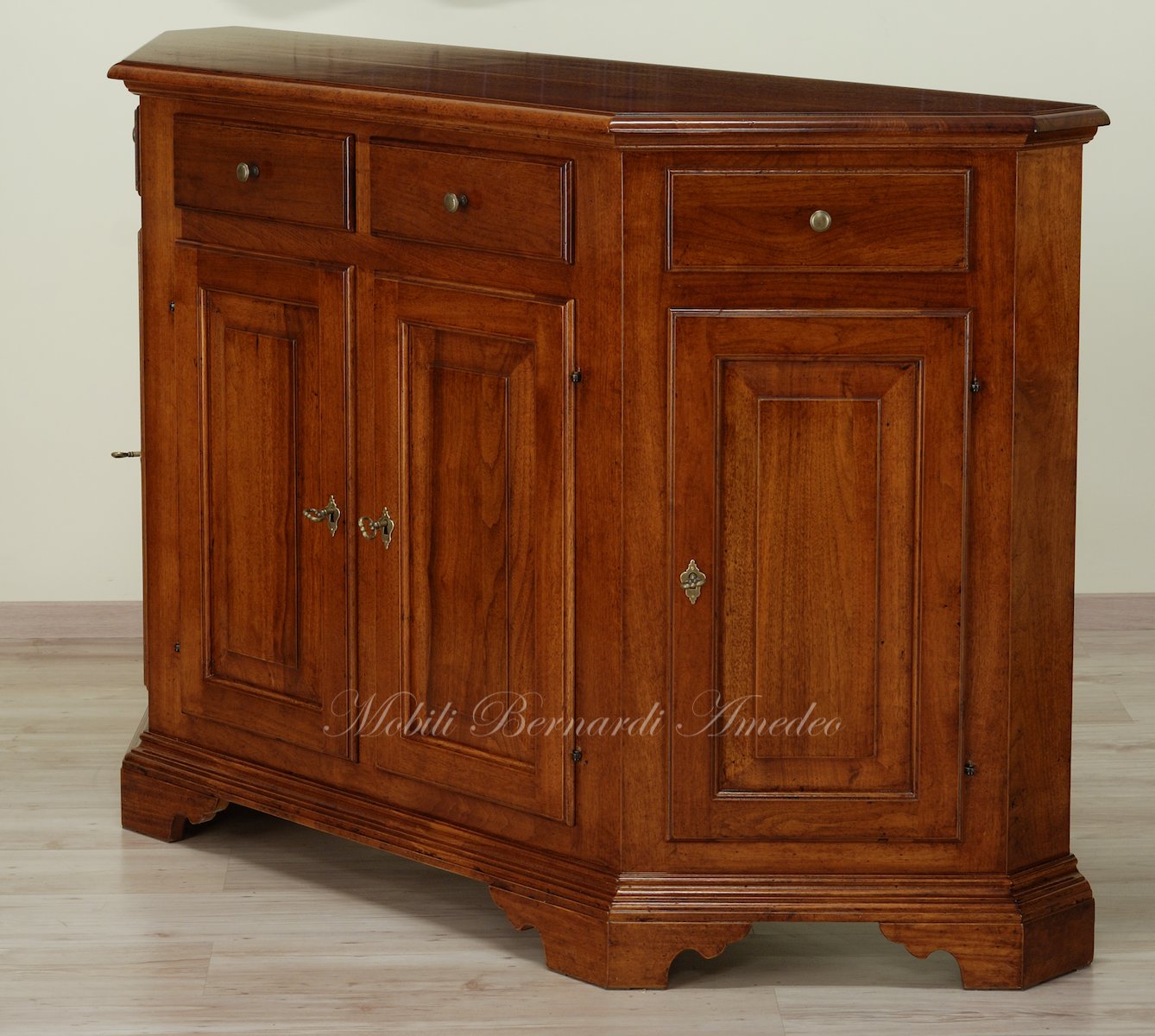 Credenze, madie venete costruite in legno massello di noce, scantonate (con angoli tagliati), parti interne in abete massello.