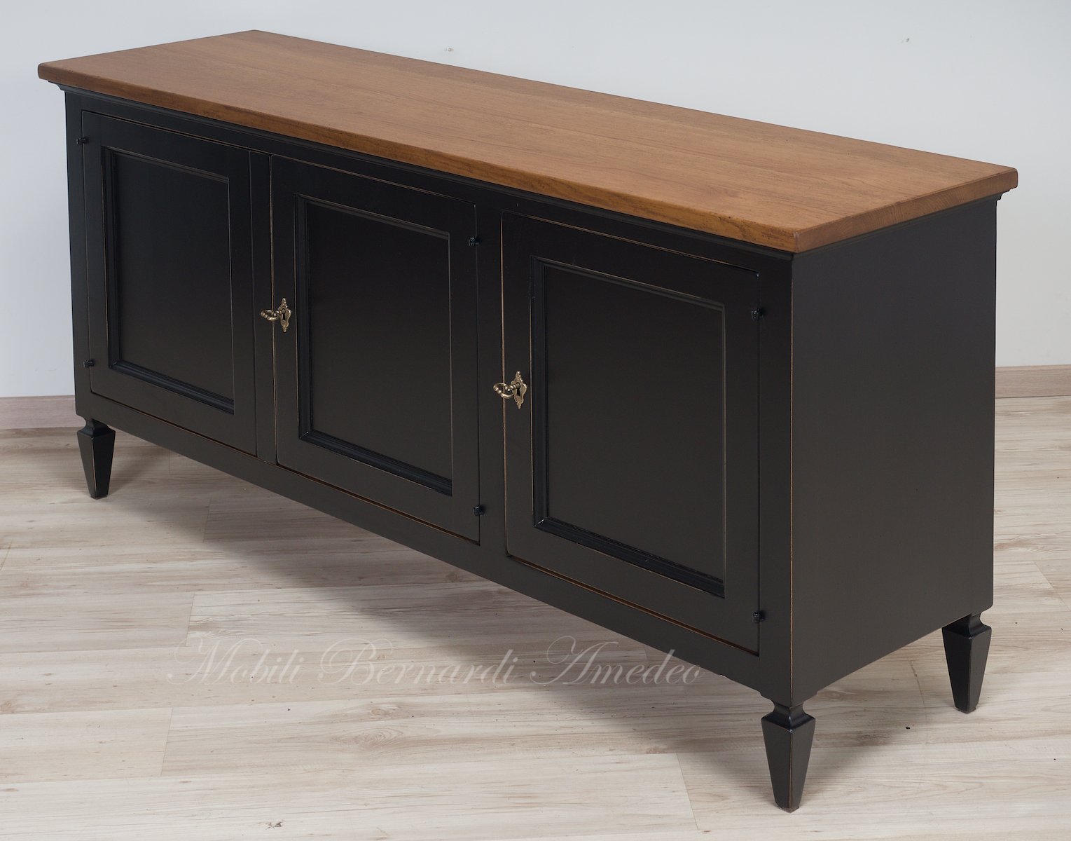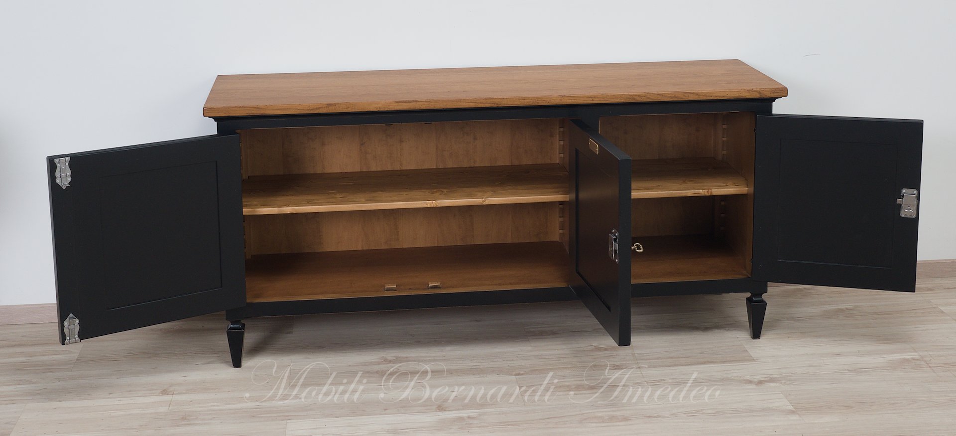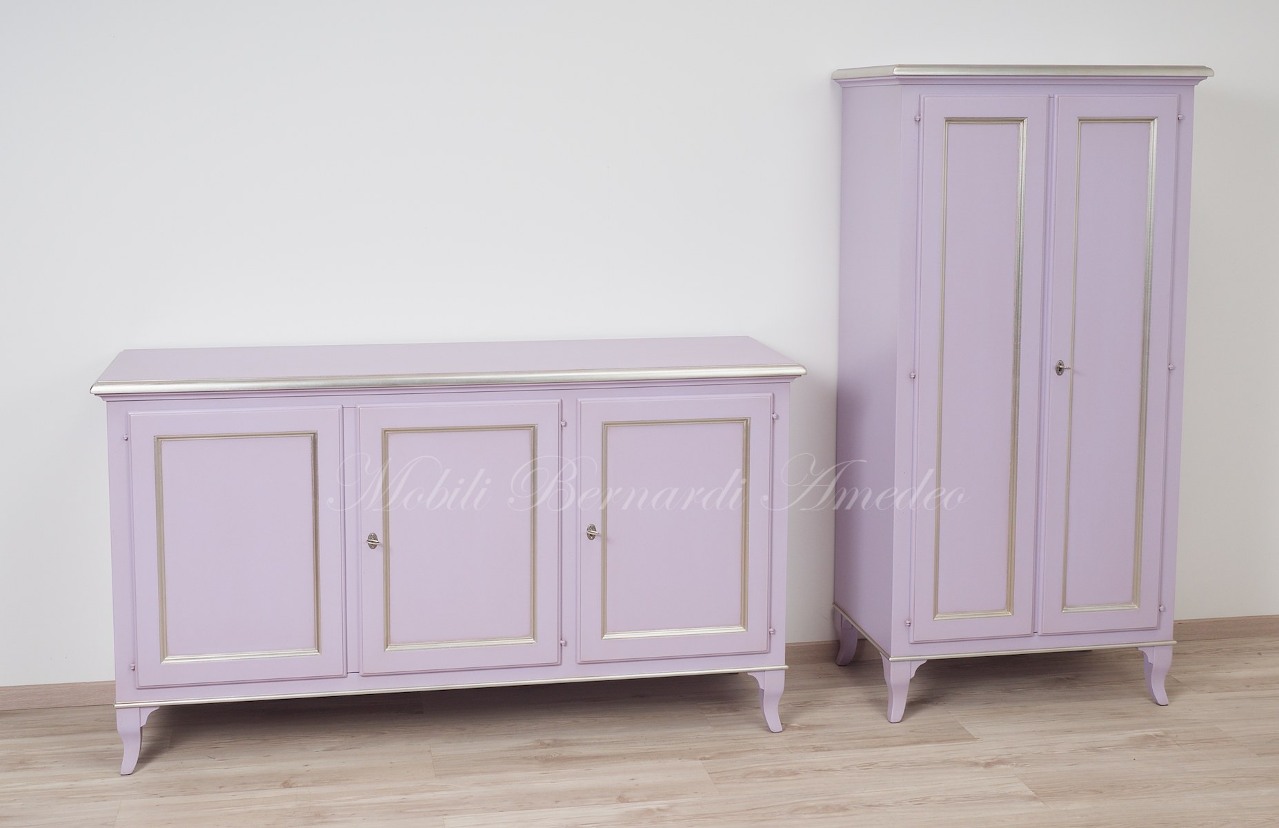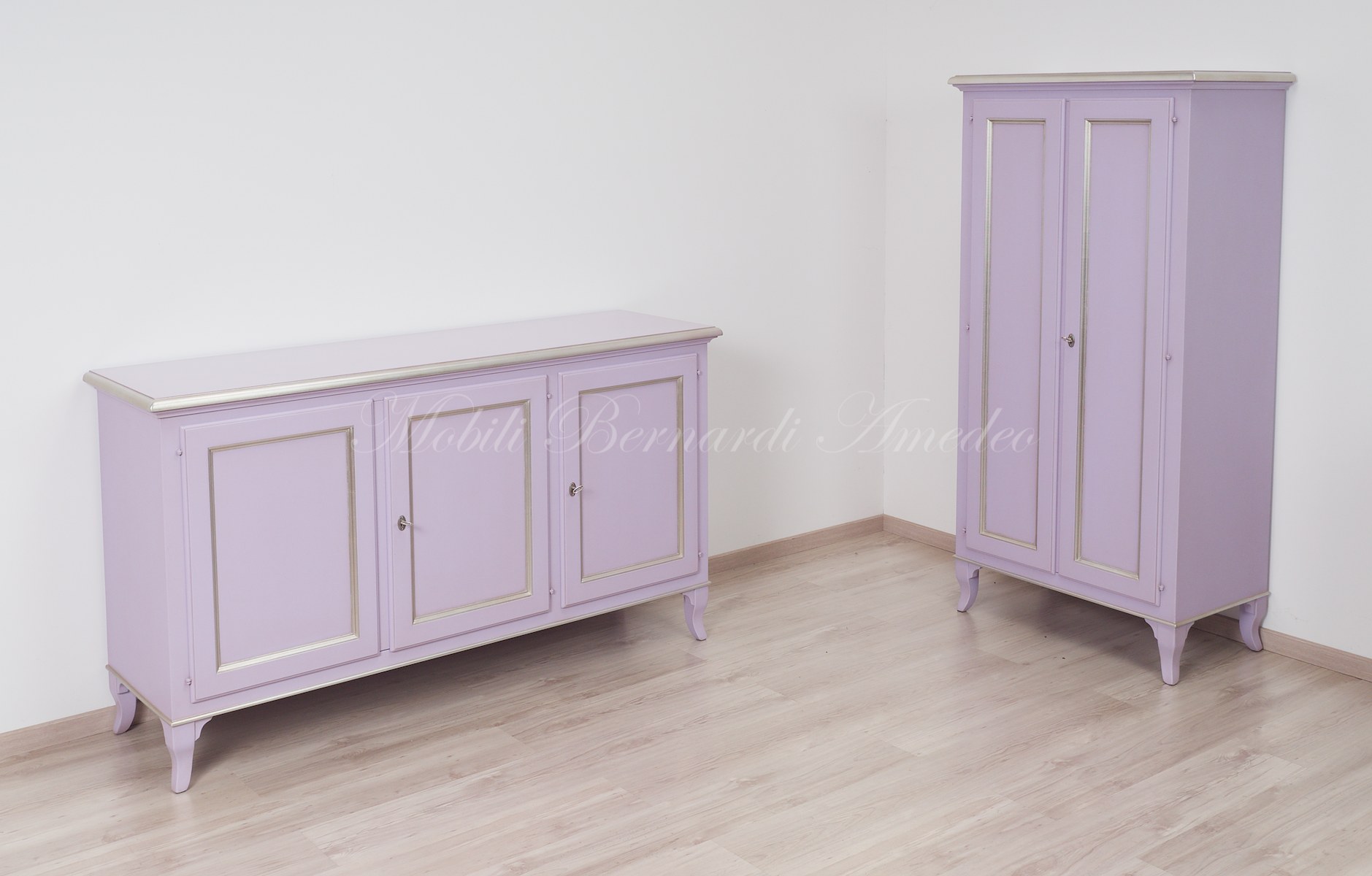 Credenza realizzata interamente in legno massello di tiglio con 3 ante in battuta, chiusura con serrature e chiavistelli, due vani interni distinti con ripiani spostabili su altezze a scelta, gambe a sciabola, modanature a becco di civetta nei bordi del piano e delle ante, cerniere ad occhiello. Credenza senza cassetti con ingombro massimo circa cm 160x46x90h. Finitura laccata colore lilla con profili in foglia argento; è possibile richiedere qualsiasi altro colore di laccatura.Nel sito è presente anche una versione con piano in noce nazionale e struttura laccata bianco avorio: