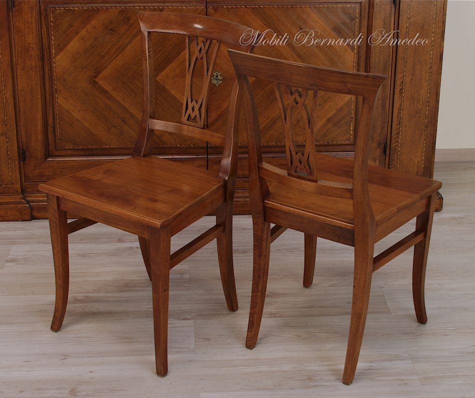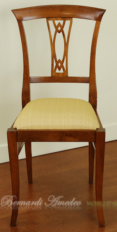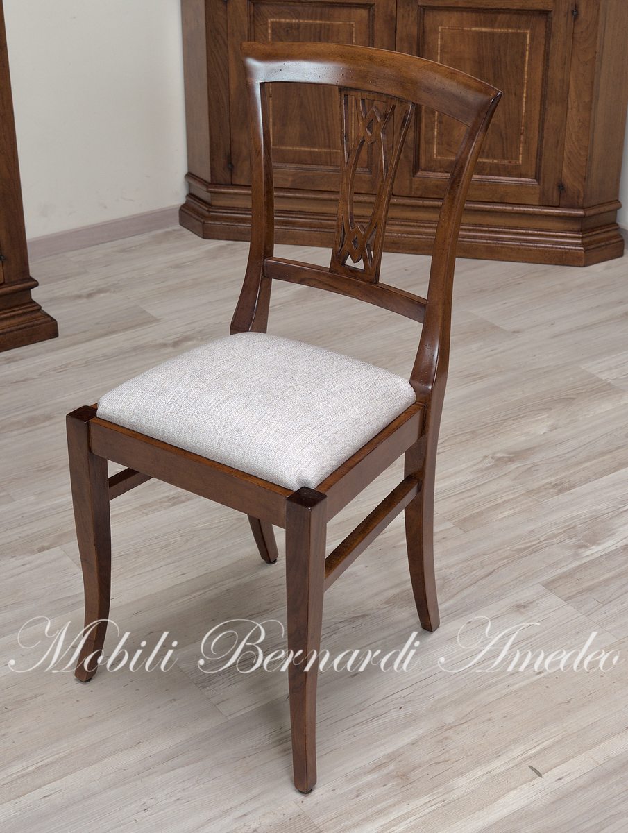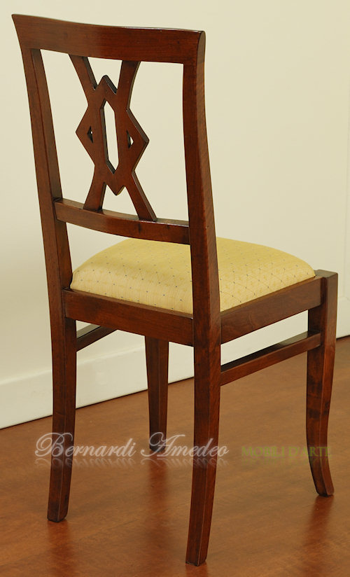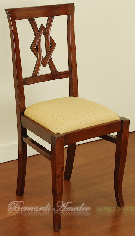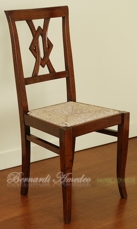 Sedia in noce nazionale, gambe a sciabola, schienale con rombo intagliato. Sedute disponibili: paglia, noce massello, canna viennese, telaino imbottito (tessuti a scelta).