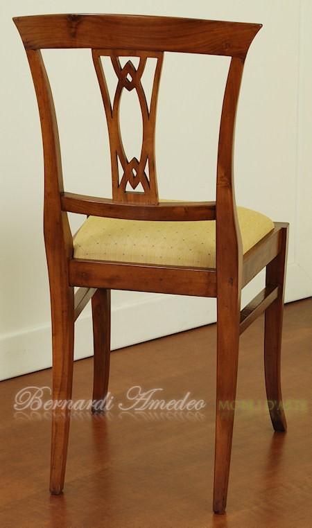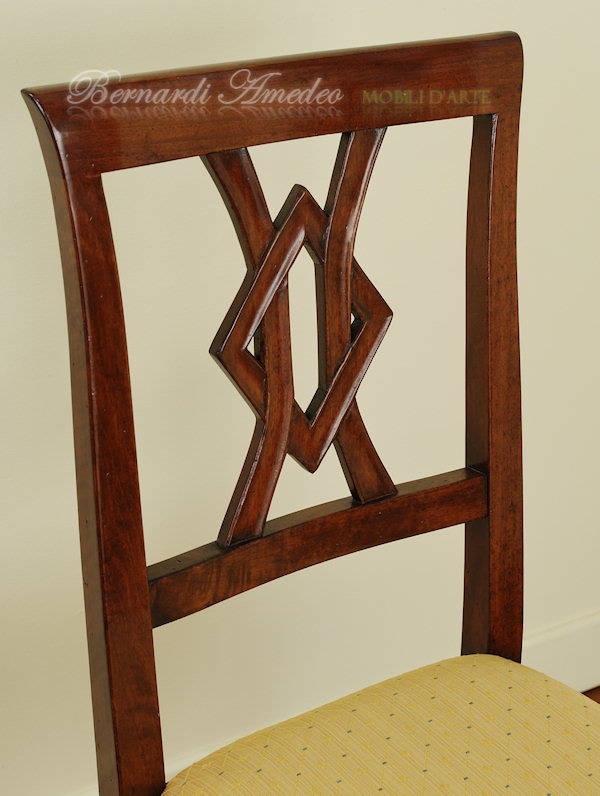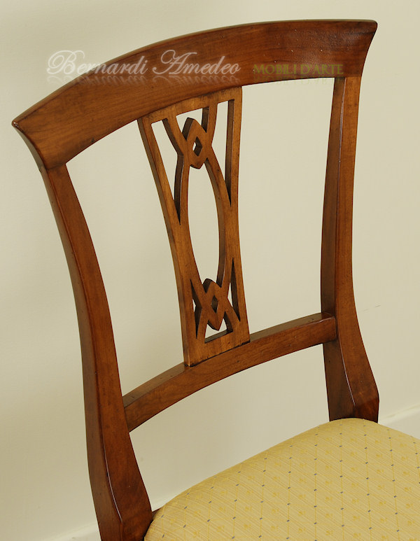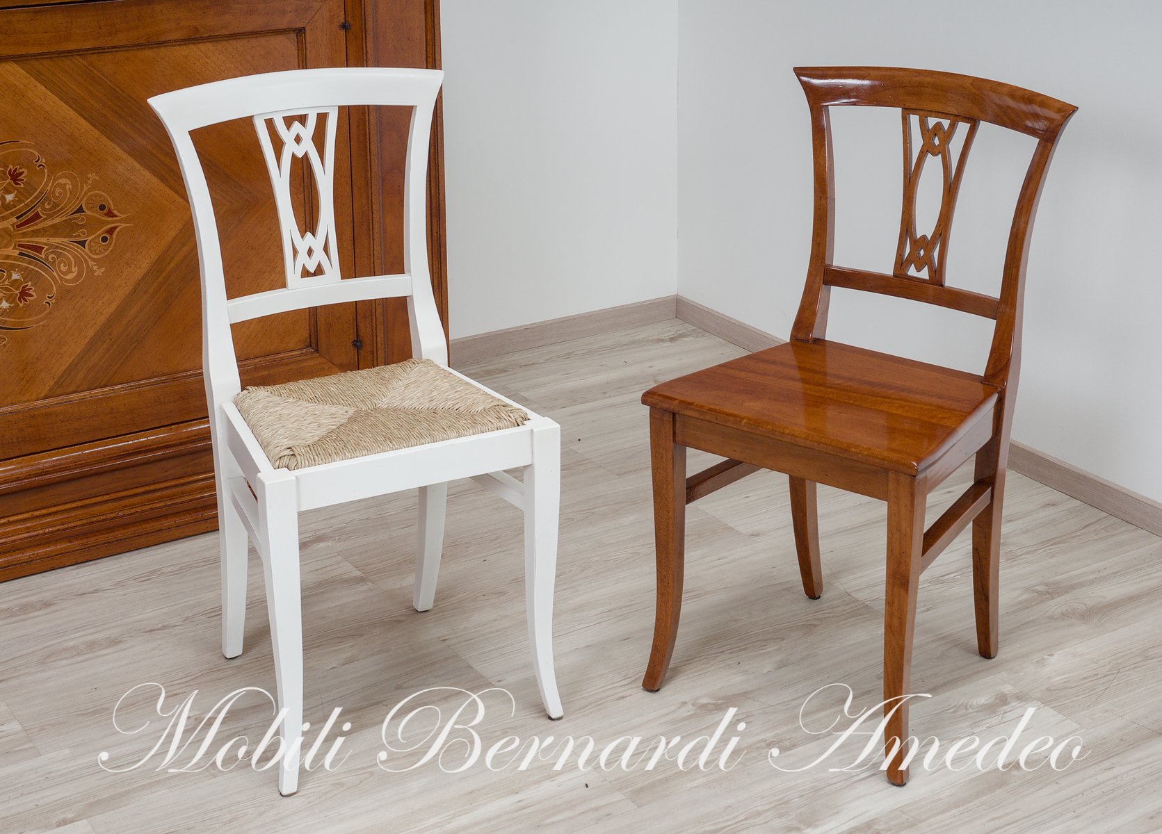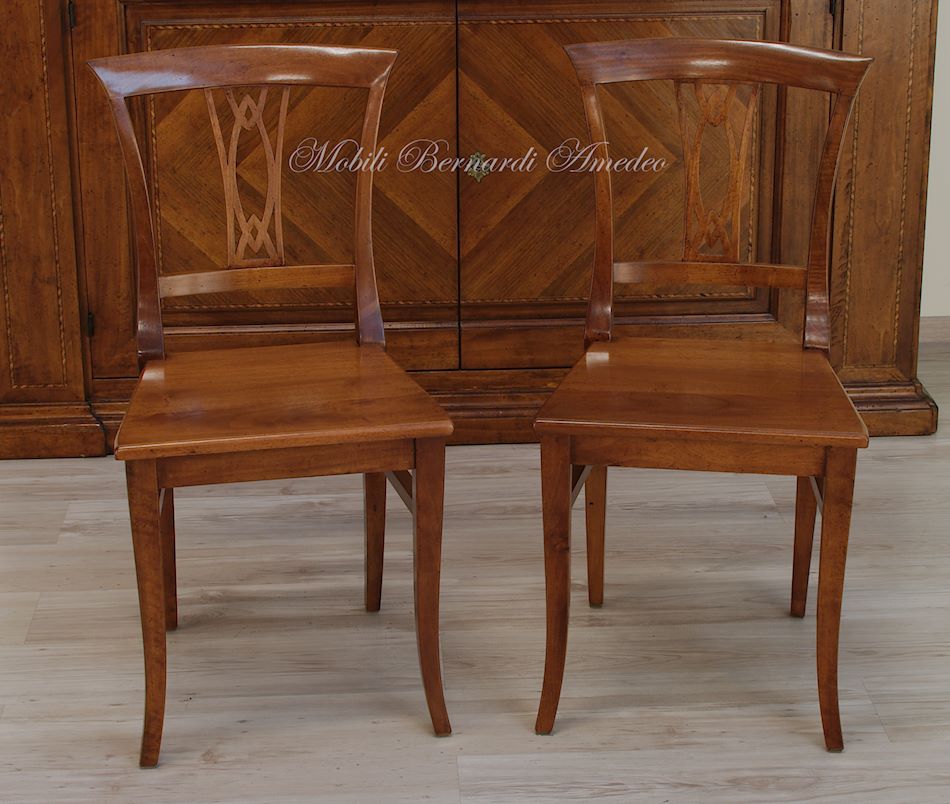 Sedia in noce nazionale, gambe a sciabola, schienale con rombo intagliato. Sedute disponibili: paglia, noce massello, canna viennese, telaino imbottito (tessuti a scelta).
