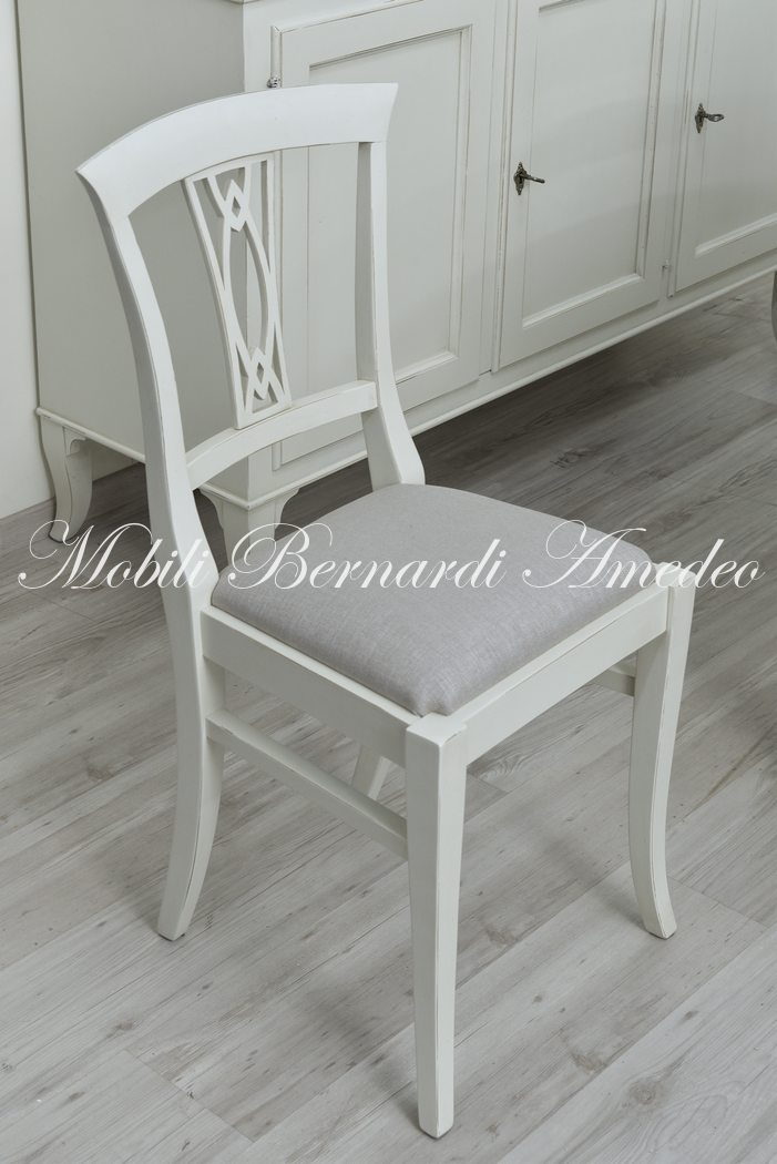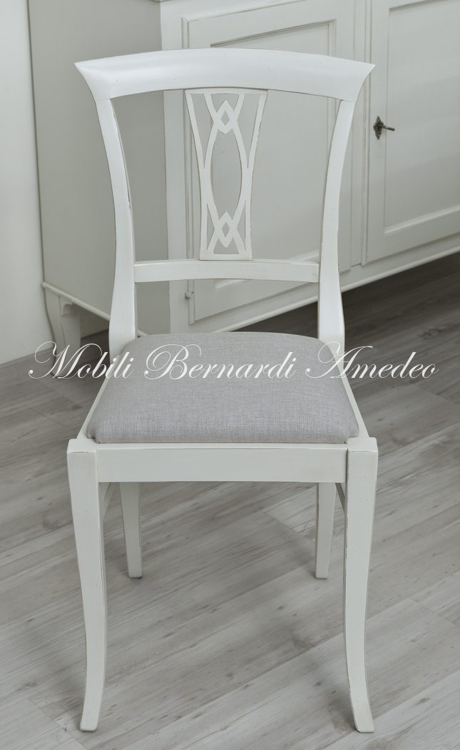 Sedia modello SE38 con finitura laccata bianco anticato, in faggio massello. Seduta imbottita. Disponibile anche con altre colorazioni.