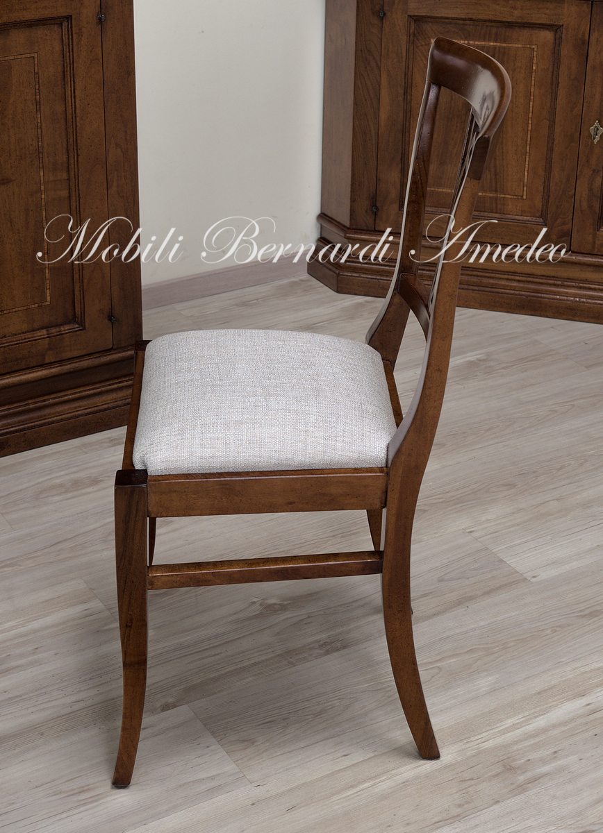 Sedia in noce nazionale con gambe a sciabola, rinforzi laterali, schienale leggermente curvo. In foto telaio interno tappezzato con tessuto (altri tessuti disponibili).