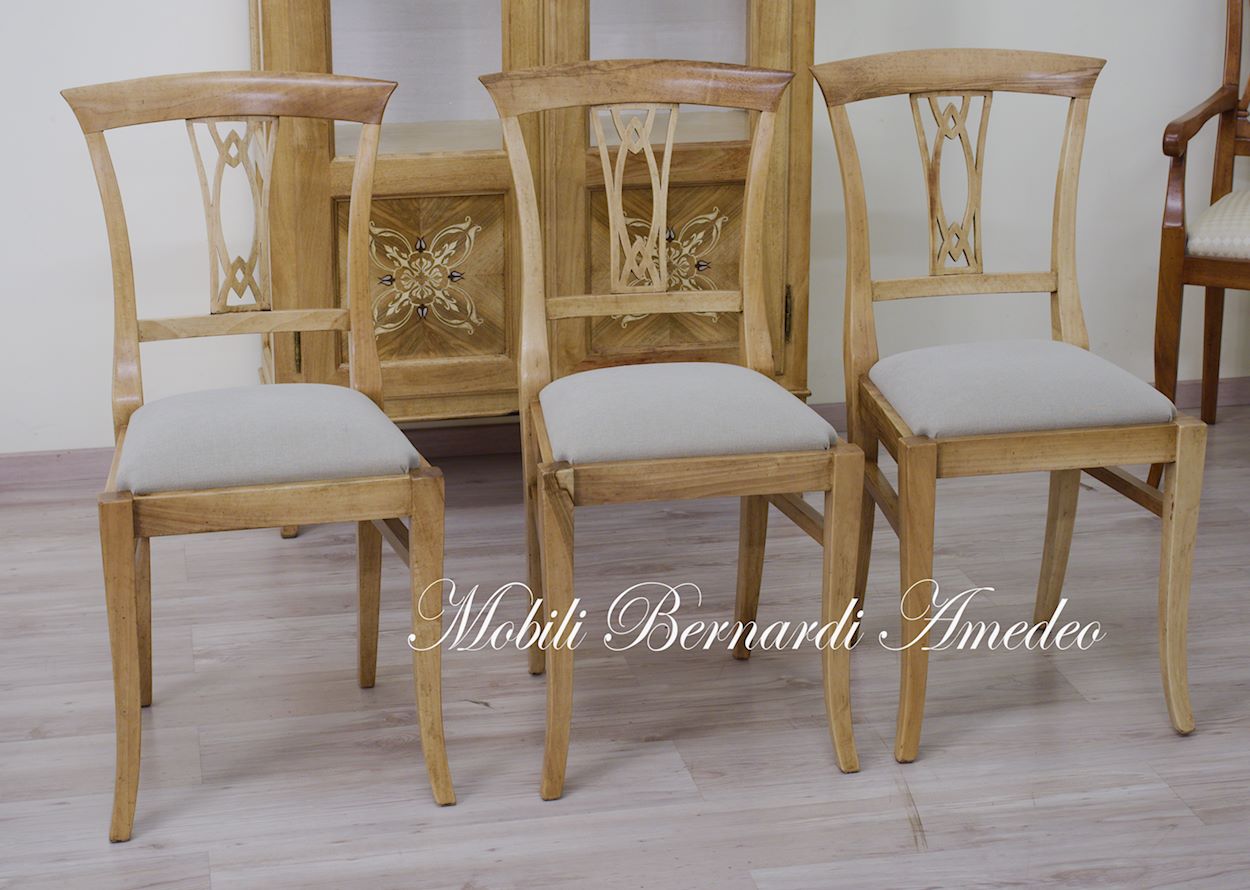Sedie e poltroncine in stile classico, costruite artigianalmente in noce massello e prodotte interamente in Italia. La seduta è disponibile con telaio impagliato, imbottito, canna di Vienna, noce massello. Tessuti di rivestimento a scelta del cliente. Tonalità di verniciatura personalizzabile.